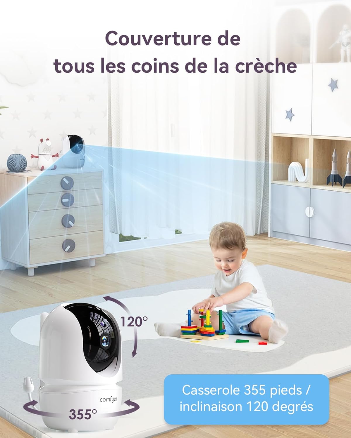 (355 ° PTZ Baby Monitor Remote Control et 7 pouces Écran de couleur): Profitez d’un grand écran de 7 pouces sur ce moniteur de caméra pour bébé. Vous pouvez connecter jusqu’à 4 caméras à la même unité d’affichage. La caméra à distance tourne horizontalement 355 ° et verticalement 120 °, vous permettant de voir une vue plus grande de la chambre de votre bébé. La fonction 4x Zoom garantit une vision claire. La caméra sans bruit tourne pour créer un environnement paisible.