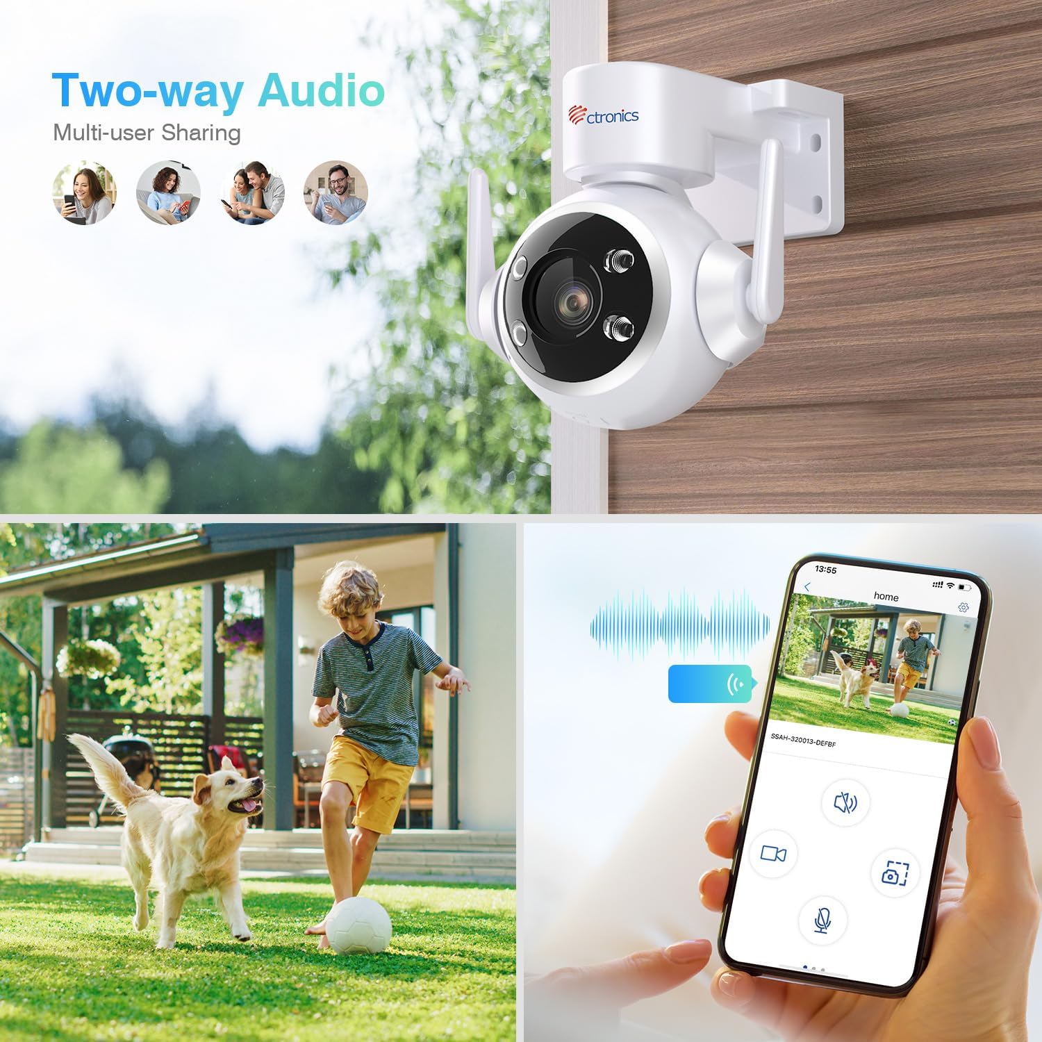 【Partage audio et multi-utilisateurs bidirectionnel】 La caméra IP extérieure a un haut-parleur et un microphone intégrés pour une communication en temps réel ou avertir des intrus indésirables pendant votre absence. Le partage de l’image de cette caméra en plein air ctronics est désormais un jeu d’enfant, grâce à sa fonction de partage multi-utilisateurs et d’accès à distance. Si vous avez plusieurs caméras ctroniques, vous pouvez facilement les gérer à partir d’une seule application.