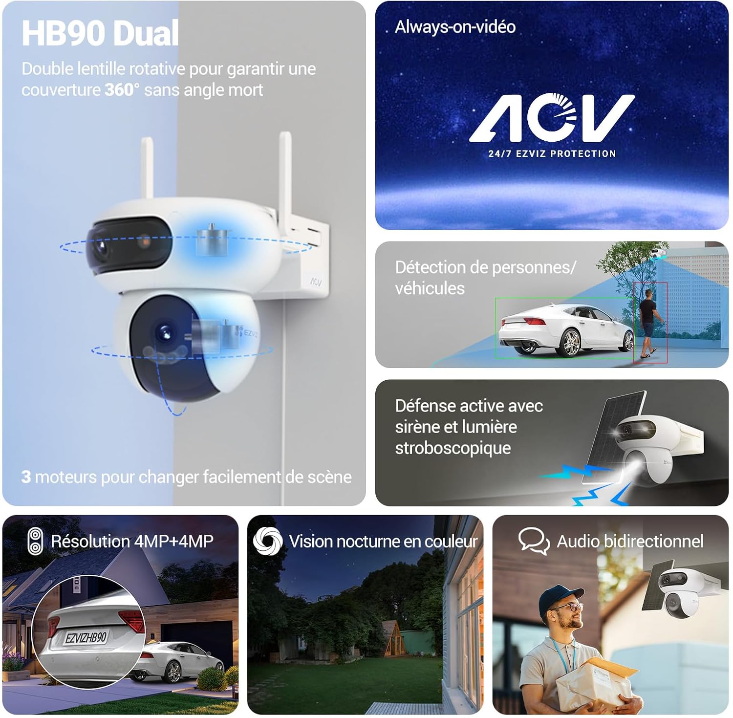 【Dual Lens 2K+ (4MP+4MP)】 With its innovative 3-motor design, the HB90 Dual stands out from traditional dual lens models, where only the lower lens is rotatable. The outdoor camera offers a rotation of 220° horizontally and 10° vertically (manual adjustment) for the upper lens (2K+), while the lower lens (2K+) allows motorized rotation of 324° horizontally and 90° vertical. A unique design for almost total coverage, without blind spots, providing unparalleled protection for your outdoor spaces. Plus, its two 2K+ lenses let you not miss any important details.